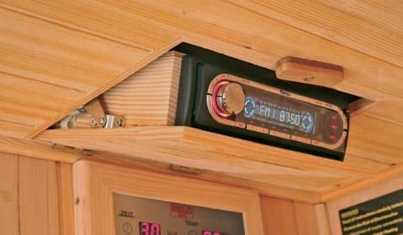 ИК сауна уже оснащена цельностеклянной дверью, цветотерапией, музыкальной системой (MP3, CD).